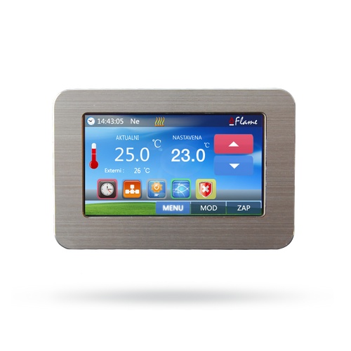 Termostat je vybaven barevným dotekovým displejem umožňující intuitivní a jednoduché ovládání bez nutnosti stálého studování uživatelské příručky. Tělo termostatu je vsazeno do rámu z leštěného hliníku. Termostat tak zapadne do luxusních interiérů a navodí hi-tech vzhled.Pokojový termostat je vybaven programem pro řízení teploty v místnosti s možností nastavení šesti různých teplotních úseků na pracovní dny a zvlášť na sobotu a neděli. Termostat může být přepnut do manuálního módu, ve kterém lze nastavit dočasnou teplotu mimo program. Dále je k dispozici 5 módů topení (denní, noční, ekonomický, komfortní, protizámrzný)