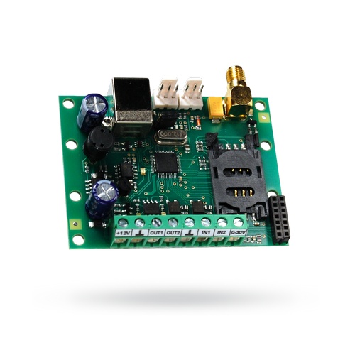 Miniaturní GSM modul s výstupy a vstupy pro vzdálené ovládání externích zařízení. Lze jej využít i pro přenos informace o stavu zabezpečovacího systému nebo jiného zařízení na mobilní telefon. Vybaven dvěma vstupy a dvěma výstupy pro ovládání. Lze připojit dva nezávislé teplotní senzory. Připojení a nastavení se provádí přes PC pomocí USB portu a programu.